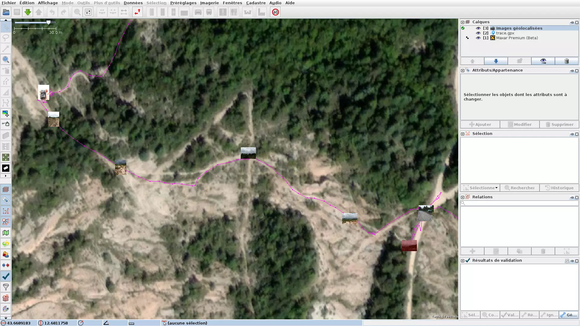Lorsque je géolocalise des photographies, c’est en général dans le but de contribuer à OpenStreetMap (une photographie remplace avantageusement une prise de notes dans bien des cas). Du coup, je vérifie leur géolocalisation dans JOSM :